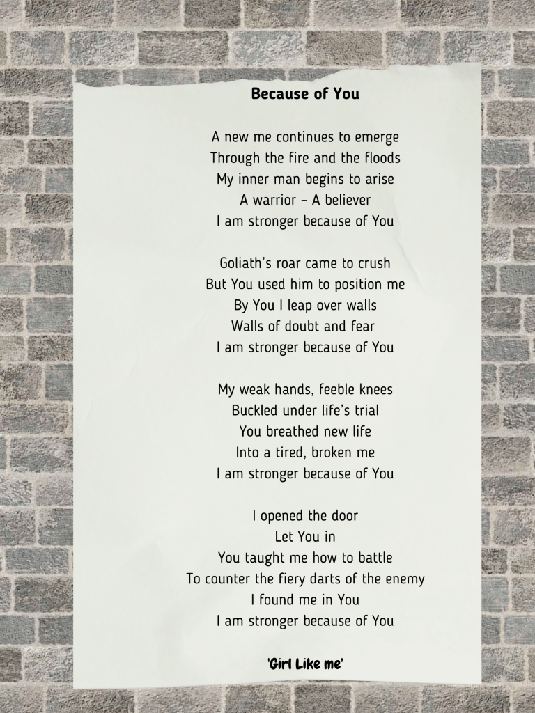 It is in my weakness that I find strength in the only One who loves me beyond measure. I walk through the twists and turns of life infused with His strength. So I am no longer at war with the cracks in the flawed me. I find a place to bring them – at His feet. The feet of a Heavenly Father who is bigger than all that comes against me. There’s space for you too…