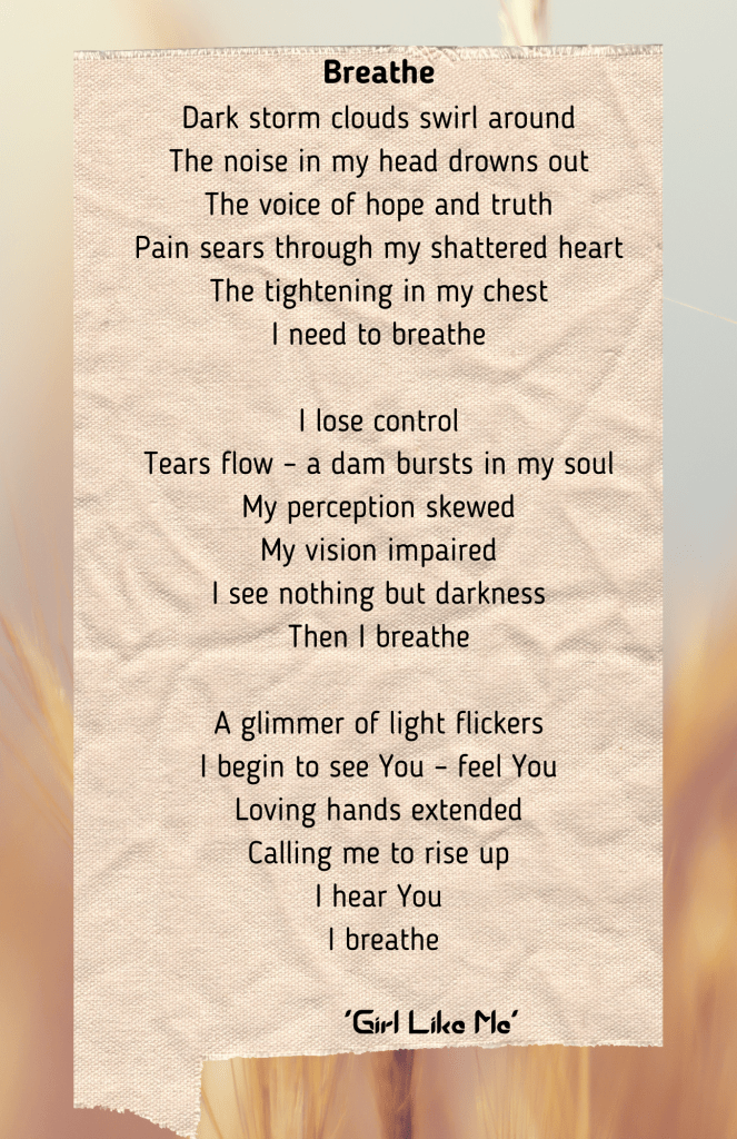 Recently, I have had to ‘breathe’ a time or two. I don’t suffer form anxiety attacks but I have had some difficult moments when I felt like the ‘wind’ was knocked out of me. There have been moments when I heard a calm voice from deep down in my spirit telling me ‘to breathe’. These were the moments when I lost control of my thoughts and allowed lies and negative voices to invade my space. I literally have had to breathe deeply and speak to my soul. Have you ever been there?
