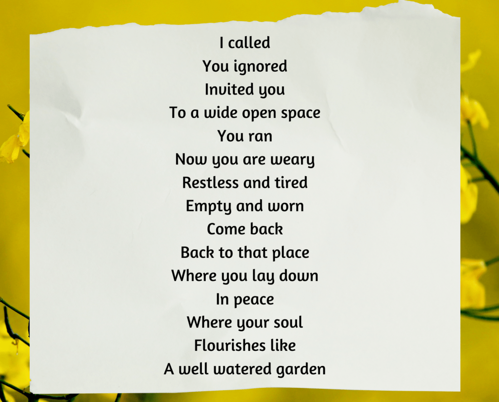 Often times we become weary trying to resurrect things that God has declared dead. The season has ended and we are still toiling in barren ‘soil’. The end result is that we are moved from a place of peace. We become tired fighting to stay in places we have outgrown; places that drain us of our peace- places where we don’t belong. At times, places where we are not valued. There is a tiredness that requires peace. That peace that rejuvenates and refreshes. The peace that alleviates fear and gives clarity of mind. Come back to that place of peace.