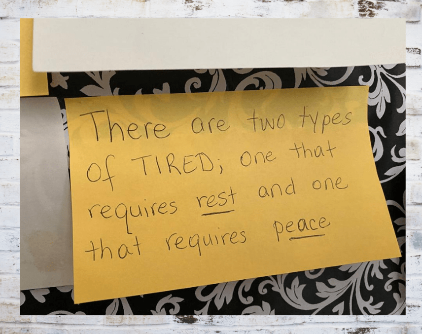 A friend of mine sent me this sticky note this week. With that she wrote one line ,’ I’m closing my business by July 31.’ I responded letting her know that I support her whatever she chooses to do. As I thought about this little sticky note – I realized that we need the wisdom to know the difference. Does my tiredness require rest or peace?