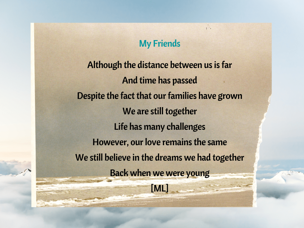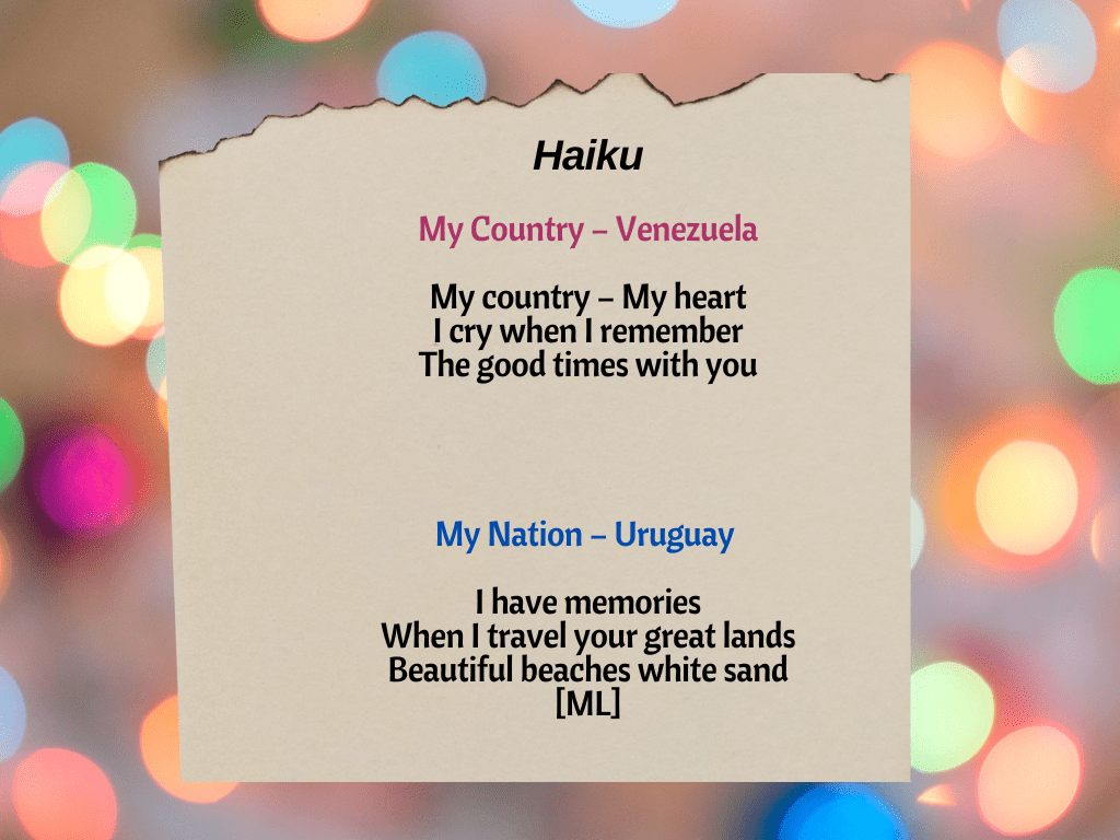 I love the atmosphere in my classroom. The sense of calm — a safe place. Here My students are allowed to feel and speak (or write). They are all immigrants with a passion to master the art of speaking, reading and writing English fluently. A challenging road for many. They feel. Emotions and thoughts bathe their person in deep ways: fear, loneliness, loss, expectancy, disappointment, relief, homesickness, doubt, hopelessness, despair, and happiness. Their reality can change from one minute to the next. They feel, they speak and they have my permission every day. Not so long ago I introduced them to poetry as a way of expressing their feelings. Here are a few simple pieces: