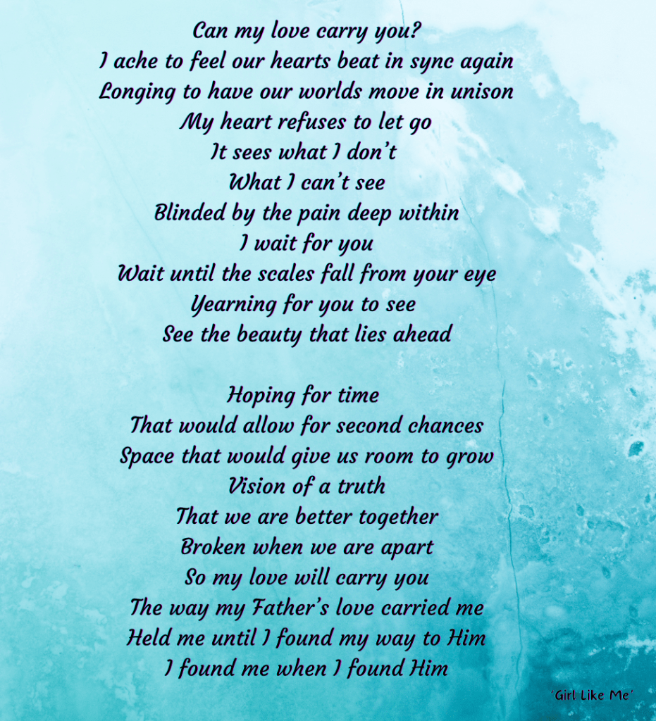 1. What a sweet love story shared by your dinner guests, and what an insightful picture into the love our Shepherd possesses for each of his wayward lambs. His love does indeed carry us! P.S. Did you write that poem, “Can My Love Carry You?” It’s beautiful and communicates profound truth, including: “I found me when I found Him.” Amen!